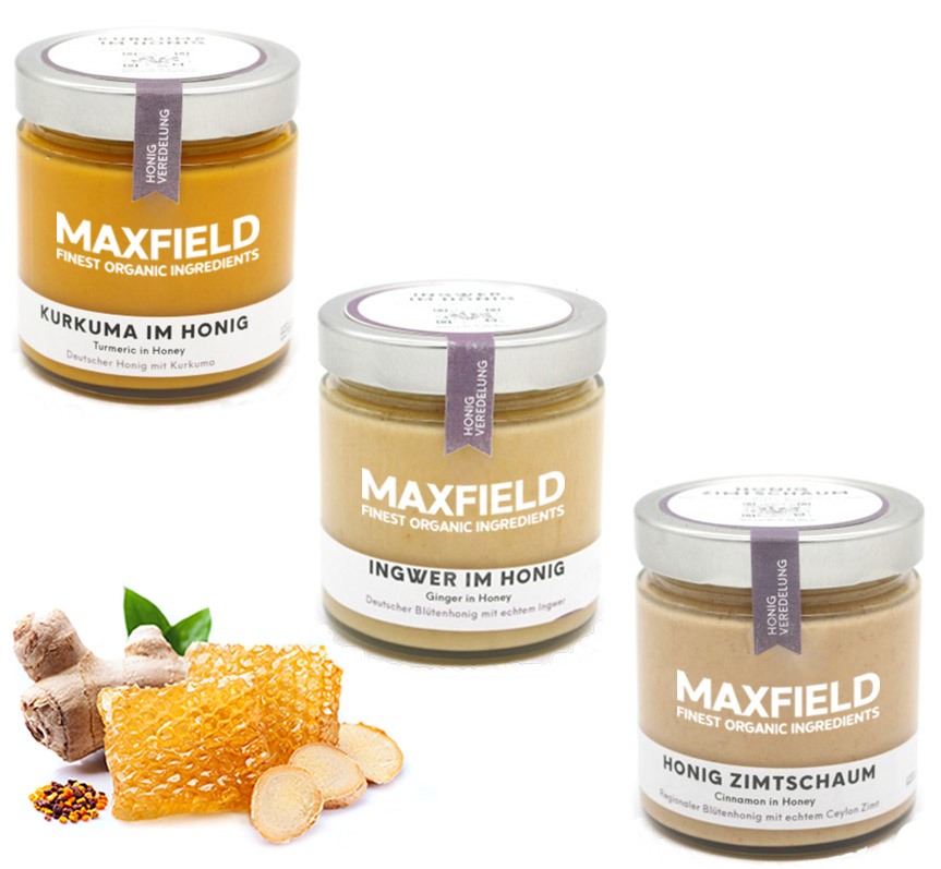 Real, pure organic ginger powder celebrates a blend with our wonderful German blossom honey. The base is mild and creamy and absorbs the fine spiciness of the ginger completely, so that we can speak of a very pleasant natural aromatization.
